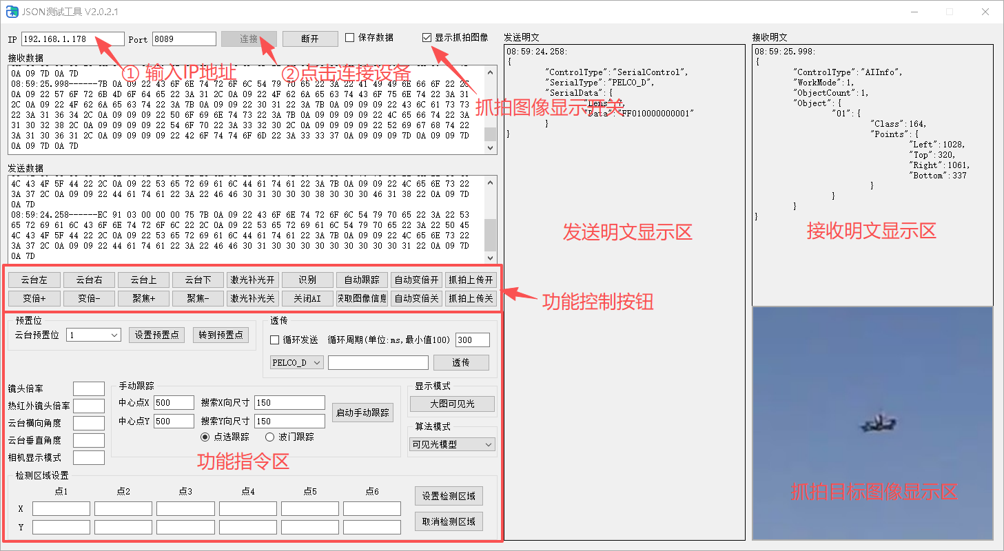 操控端中支持AI端的算法模式切换与参数配置;识别、跟踪过程中信息接收;云台与镜头的手动控制,AI端作为服务器端(Server端),操控端作为客户端(Client端),AI端口号为8089。采用JSON协议。所有JSON数据上下帧间隔不得小于100毫秒。