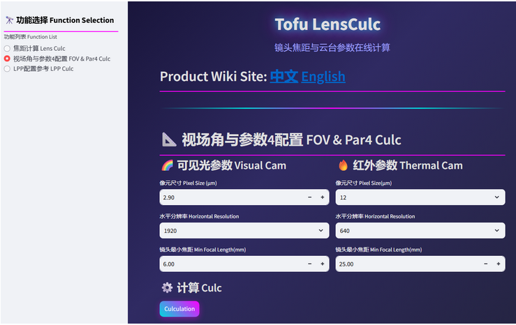 Tofu双光视频设备请使用在线工具——视场角与自定义参数4配置进行计算,本参数分LPP协议与脱靶量协议两种方式,请自行根据云台协议进行配置。